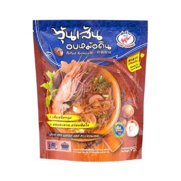 ชอช้าง วุ้นเส้นอบหม้อดิน ขนาด 95 กรัม รสชาติเข้มข้น หอมกรุ่นตามแบบหม้อดินสูตรต้นตำรับไทย วุ้นเส้นเหนียวนุ่มที่เข้ากันได้ดีพร้อมซอสปรุงรสพิเศษให้รสชาติหอมกลมกล่อม เพียงเติมน้ำร้อนแล้วรอ ก็ได้วุ้นเส้นอบหม้อดินที่หอมอร่อยราวกับทำจากหม้อดินแท้ อิ่มอร่อยได้ง่ายทุกเวลา